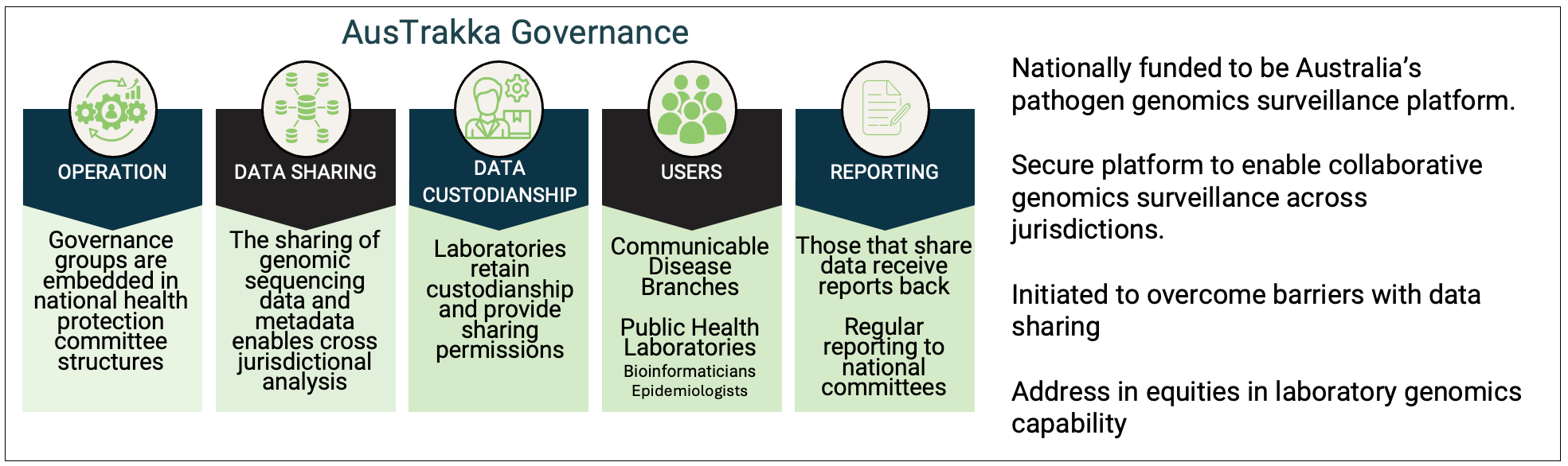 AusTrakka's governance framework ensures proper oversight and management of genomic data sharing across Australian jurisdictions while maintaining data security and appropriate access controls.